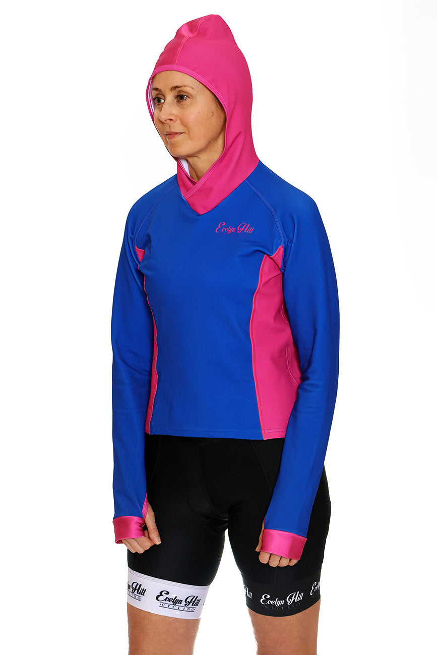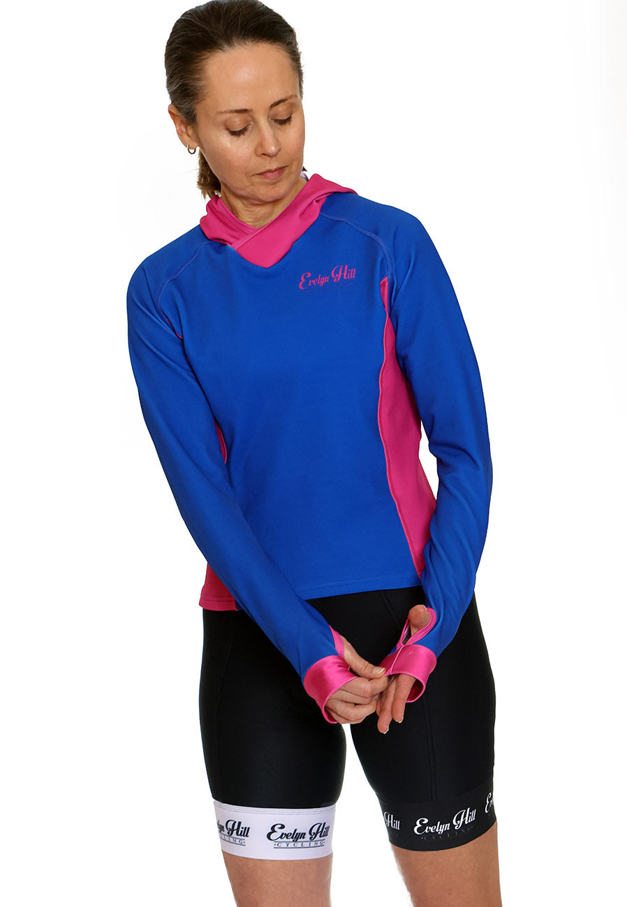 Our Berries Hoodie is made from Evelyn Hill Cycling's jersey material COOL+ and is a lightweight fleece-lined and highly breathable fabric that wears nicely in cooler weather.