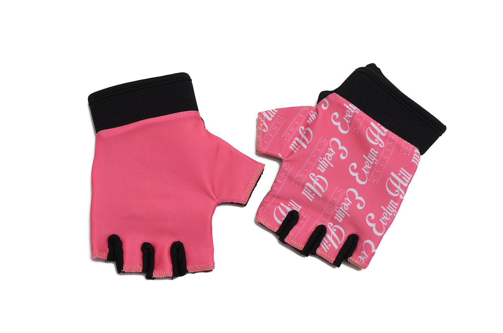 Logo left, right solid. Easy. Fingerless lightweight gloves that fit a woman’s hand from Small to XL. Velcro tab makes for easy on and off. Well padded and tested for one solid year by Evelyn Hill Cycling owner. These short fingered gloves are super-comfortable for any cyclist. Strategically placed padding helps reduce road vibrations and numbness.
