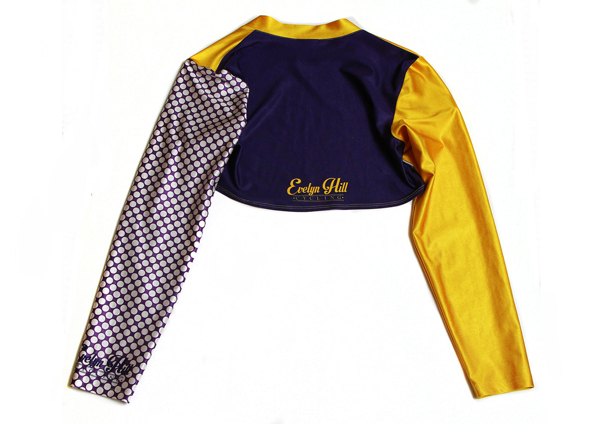 Keep your neck, back and arms warm with no annoying elastic. Our Purple Retro Bolero is made from soft- stretchy Lycra. Our Evelyn Hill Boleros are perfect transitional pieces both on and off of the bike. Wear them in place of arm warmers over our sleeveless jerseys or as an additional layer with our sleeved designs.